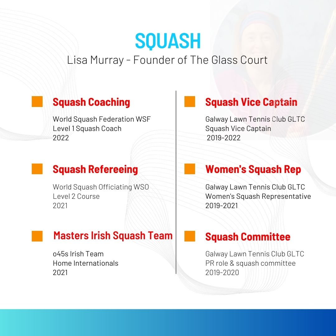 Since returning to squash, Lisa has also taken new directions in learning and education. She has achieved a World Squash Federation Level 1 coaching certification, completed World Squash Officiating Level 2 referee courses, and obtained a Certification in Fitness and Conditioning.